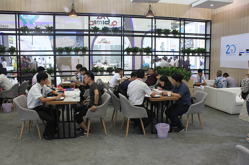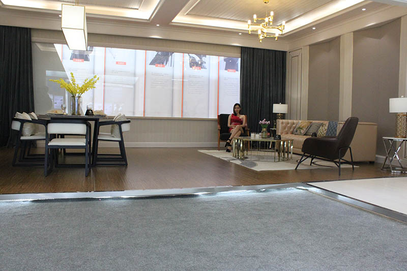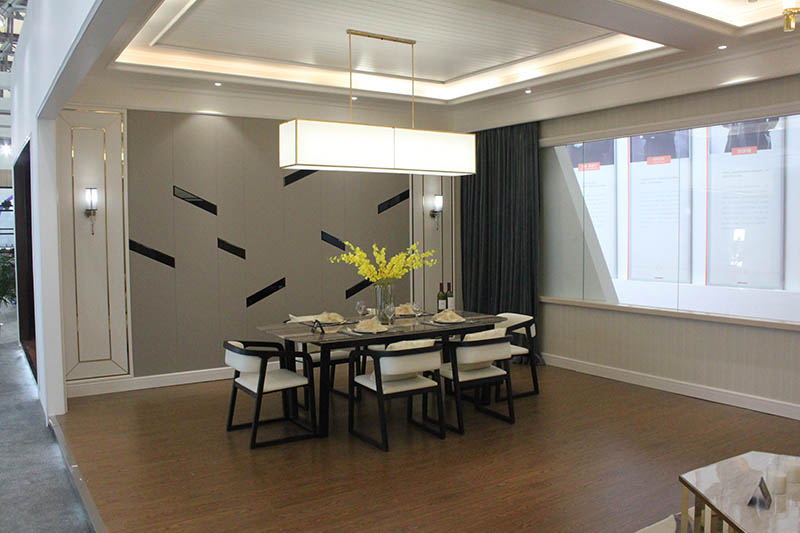 展館入門(mén)即現(xiàn)的大面積現(xiàn)代客廳展示精美絕倫,led大燈與回光燈交相呼應(yīng),恍惚間,讓人感覺(jué)仿佛身處一個(gè)家族聚會(huì)的中心??蛷d頂?shù)拇钆淝擅顭o(wú)比,在考慮板材與電器的融洽性的同時(shí),引入柞木碳材質(zhì),有效能吸附甲醛甲苯等有害氣體,美觀與健康兼具。