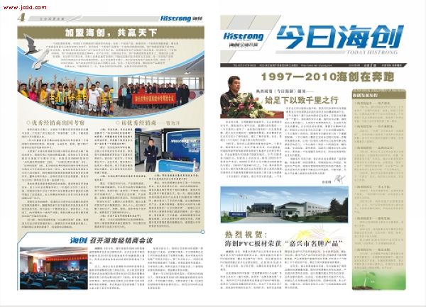 《今日海創(chuàng)》定性為季刊,每個(gè)季度的第二個(gè)月初出版,分為四個(gè)版面報(bào)紙?jiān)诿嫦?/SPAN>經(jīng)銷商和消費(fèi)者提供公司產(chǎn)品介紹的同時(shí),也會(huì)采納讀者的建議和意見不斷完善報(bào)紙的內(nèi)容和版面。